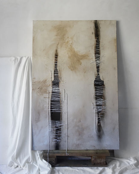 Stone Particles, Pigment, Acrylic, Fire, Embroidery on Canvas